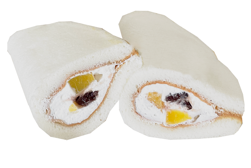白いスポンジで練乳ホイップとみかん・パイン・黄桃・粒あんを包みました。