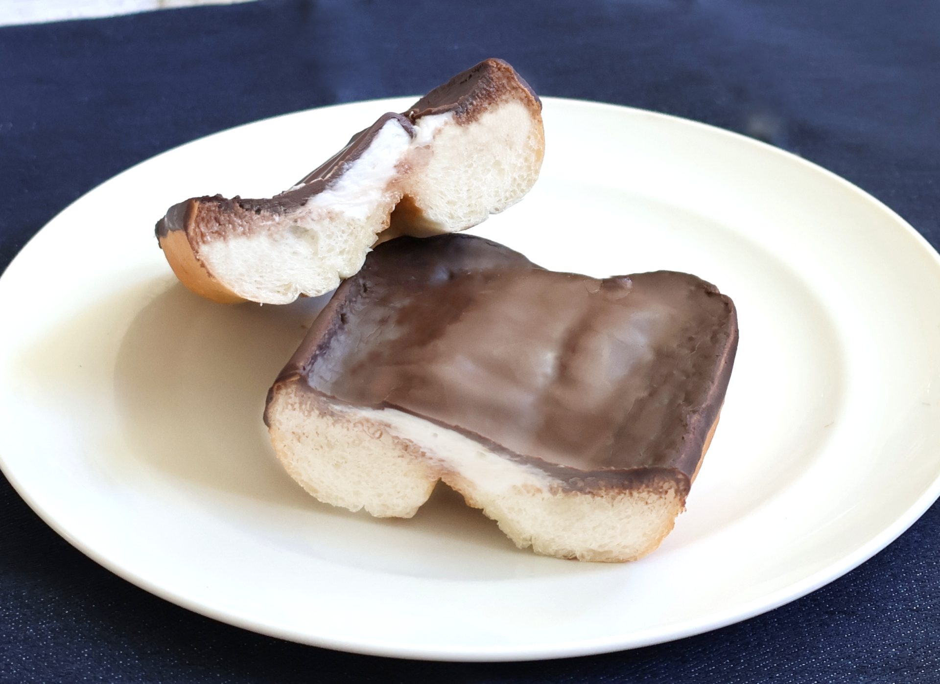 背割りして開いたロールパンにミルク味のクリームを塗りさらにチョココーティングしました。
