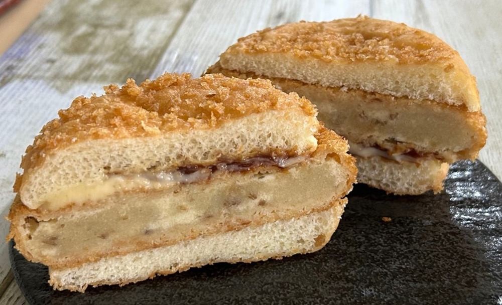 ポテトコロッケ(国内製造)、小麦粉、植物油脂、パン粉、マヨネーズ、ソースフィリング、砂糖、ショートニング、卵、ぶどう糖、パン酵母、食塩、発酵風味料/酢酸(Na)、グリシン、乳化剤、増粘剤(メチルセルロース、加工デンプン、キサンタン)、膨脹剤、加工デンプン、pH調整剤、調味料(アミノ酸等)、着色料(カラメル、カロテノイド、フラボノイド)、酸化防止剤(V.E)、トレハロース、イーストフード、香料、V.C、シリコーン、(一部に乳成分・卵・小麦・大豆・牛肉・りんごを含む)