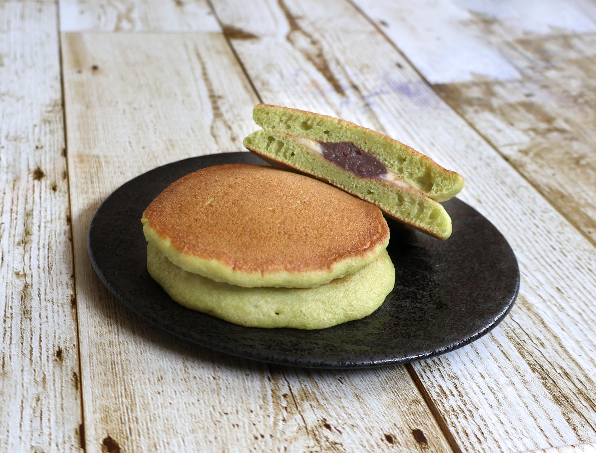 京抹茶入りのホットケーキ生地に粒あんとマーガリンをサンドしました。