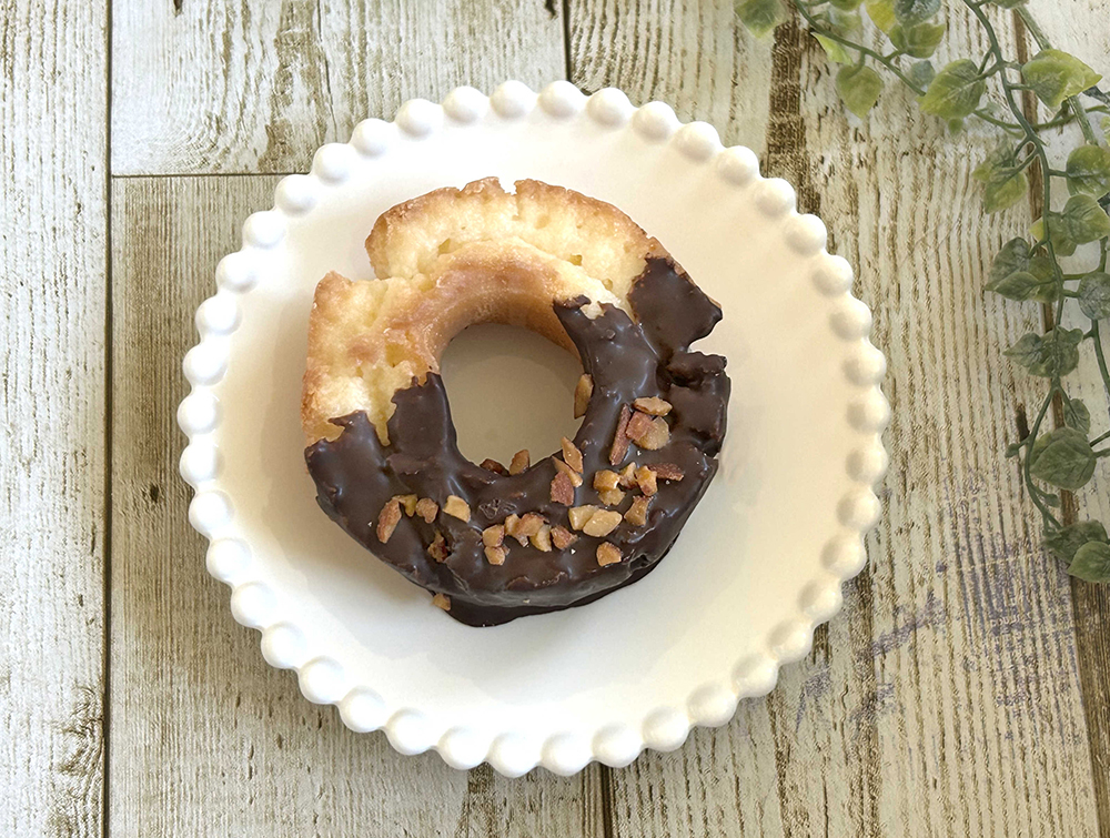くちどけのいいケーキ生地のドーナツにチョココーティングし、アーモンドをトッピングしました。